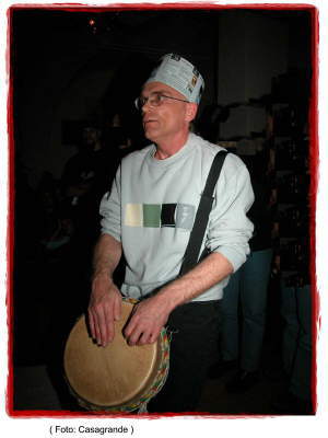 Dann, 1975 neuerliche "Bastelphase". Zwei Jahre plante, werkelte und lötete ich an einem selbstzubauenden 16 Kanal-Mixer mit 8 Aux-Wegen, Effekten (Hall, Echo, Vibrato usw.), alles - klaro - noch analog, aber ich konnte damit mit Freunden zusammen schon g´scheit Liverecording machen. Die ganzen achziger Jahre waren dann eher von "passivem" Musikgeschehen geprägt: Ich war frisch verheiratet. 1991 war dann für mich ein bedeutsamer musikalischer Wendepunkt. Das Angebot eines Samba-erfahrenen Lehrers aus Garching an der Alz, Hans-Georg Kastner, einer Afro-Trommelgruppe bezutreten, faszinierte mich, trieb mich begeistert in die Selbsterfahrung westafrikanischer Poly-Rhythmik: "Zwei gegen Drei", "Drei gegen Vier", Djémben, Boukarabous und besonders die mit Stöcken zu spielenden afrikanischen Basstrommeln (Kenkeni, Sanban und Doundounba) taten mir´s an und ich wurde Basstrommelspieler bei der Gruppe "Zwerchfell". 1993 kaufte ich mir aber dann doch die erste "Hand"-Trommel, die kintoartige Tubano von Remo, bereits im "native" Dekodesign. Faszinierend die instrument-technische Ausführung: auch bei Nässe und Kälte spielbar, dank Polyester-Kunststofffell, Schalldruck-Booster ähnlich wie bei einer Djémbe, Sound ähnlich einer Kinto (hochtönende Conga), stundenlang spielbar ohne rote Hände und taube Finger zu bekommen. Wie dankte ich damals schon dem mir noch unbekannten Konstrukteur wegen dieses Instuments und kaufte die mittlere und die tieftönende Tubano ein Jahr später nach. Ein Jahr nahm ich auch Conga-Unterricht bei Claus Tischer (Prien am Chiemsee) und eignete mir einige nordbraislianische Rhythmen an.